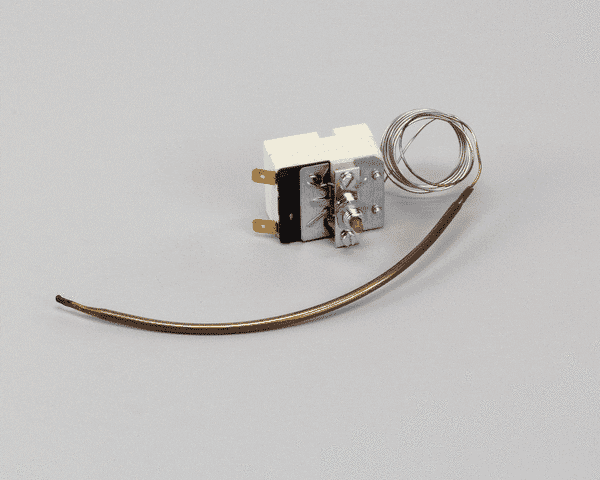 A thermostat is a device that is used to control the temperature in restaurant equipment such as ovens, grills, fryers, and refrigeration units. The thermostat is an integrated component and is connected to a temperature sensor, which measures the temperature inside the equipment. The thermostat uses this information to control the heating or cooling elements in the equipment, turning them on or off as needed to maintain the desired temperature. This allows the equipment to operate at the optimal temperature for the specific food or beverage being prepared, ensuring that it is cooked or cooled to the proper level.